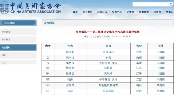 2025年度上半年,杨勇老师国画作品《老朋友》入选由中国美术家协会、中国文联美术艺术中心、江苏省文化和旅游厅、江苏省国画院、江苏省美术馆共同举办的“抱石风骨——第三届中国画双年展”。