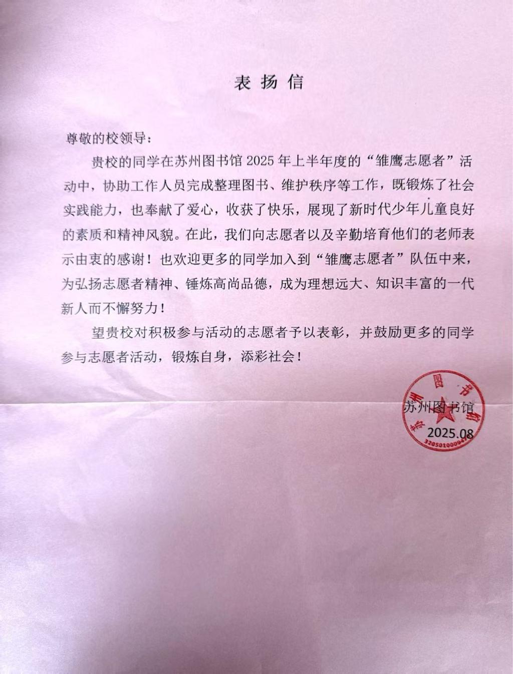 近日,我院财务2321班李心妍等7名同学收到来自苏州图书馆的表扬信,信中对我院志愿者积极参加2025年上半年“雏鹰志愿者”活动,认真协助工作人员完成整理图书、维护秩序等工作给予了充分肯定,表示了诚挚的感谢。