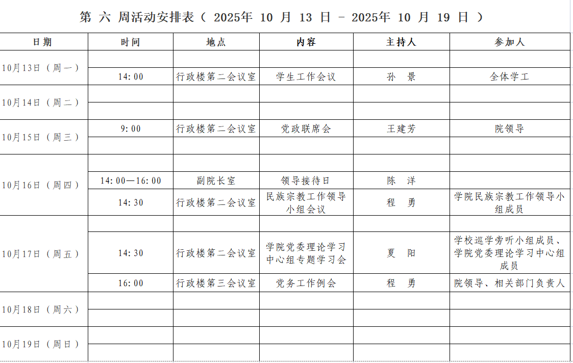 第 六 周活动安排表( 2025年 10 月 13 日 - 2025年 10 月 19 日 )