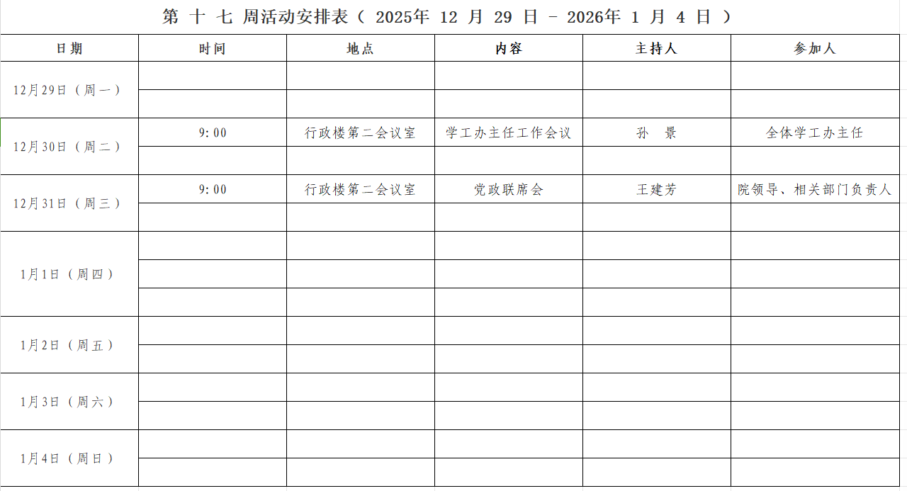 第 十七 周活动安排表( 2025年 12 月 29 日 - 2026 年 1 月 4 日 )