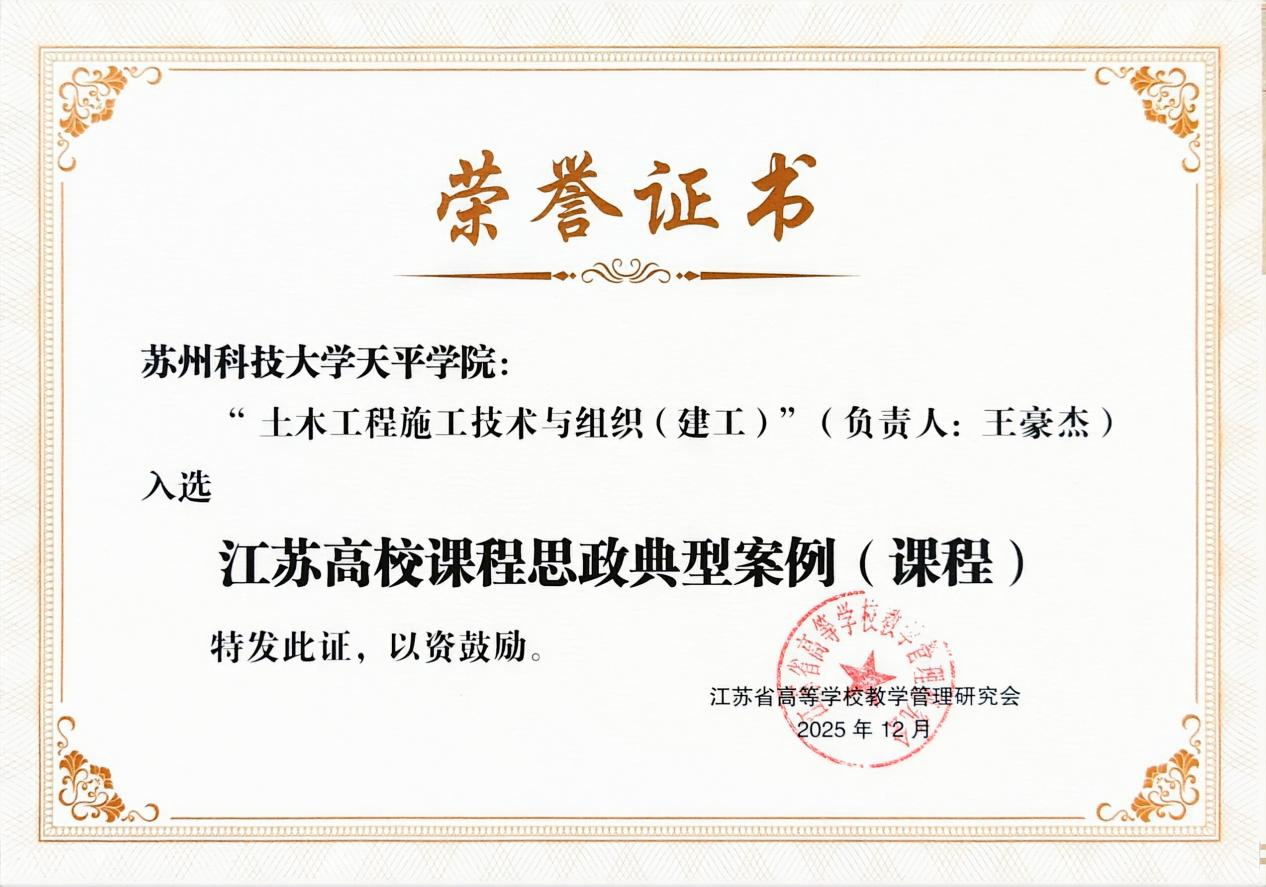 近日,江苏省高等学校教学管理研究会课程思政建设工作委员会公布了2025年江苏省普通本科高校课程思政典型案例入选名单,我院《土木工程施工技术与组织(建工)》入选江苏高校课程思政典型案例(课程)。
